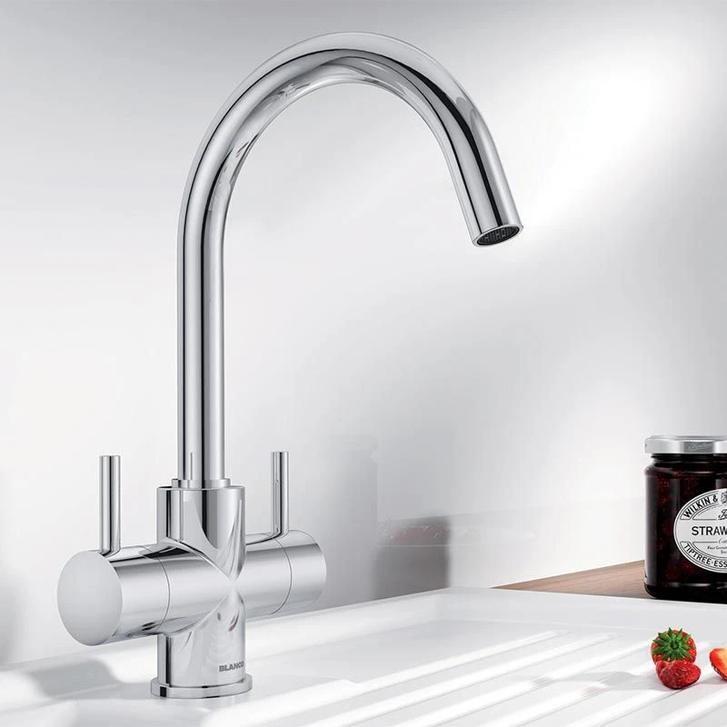 The Blanco CAMIA Twin Lever High C-Shaped Spout Galvanic Kitchen Tap features a slender body, and high C-shaped swivel spout for easy filling of pots and vases.