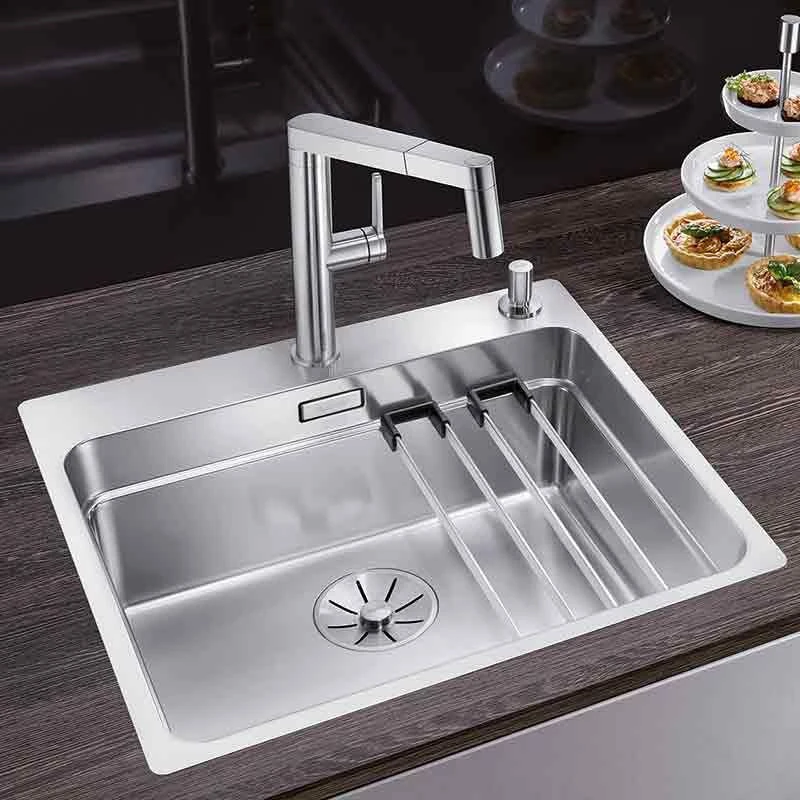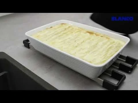 This Blanco ETAGON sink has an integrated multi-level concept, which creates an additional third functional level, thus offering versatility of a sink and drainer without requiring the same amount of space. The multifunctional ETAGON rails enable you to work in a particularly ergonomic way and carry out various activities at the same time. For instance, you can simply set hot pots down on the rails while you quench cooked vegetables in ice-cold water into the bowl below. Simply insert a cutting board into the edge of the bowl and use the area above the bowl for optimal food preparation. Freshly chopped food can be transferred directly from the cutting board into dishes placed on the rails. The multi-level concept is also ideal for cleaning bulky dishes easily. The sliding rails are an ideal place to put dirty baking trays, making washing dishes easier than ever before. Blanco ETAGON allows you go straight from one task to the next. Preparation is faster, there is no need to go from one place to another, you can save time cleaning, and your kitchen stays looking good.