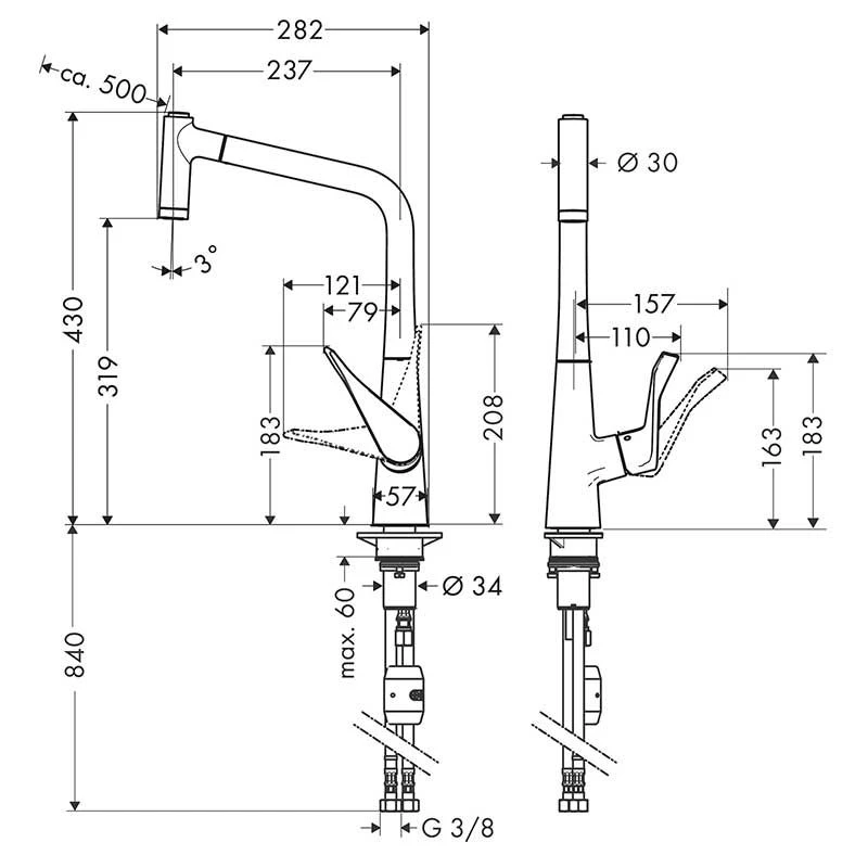 - Swivel spout adjustable in 2 steps to 110° or 150°
